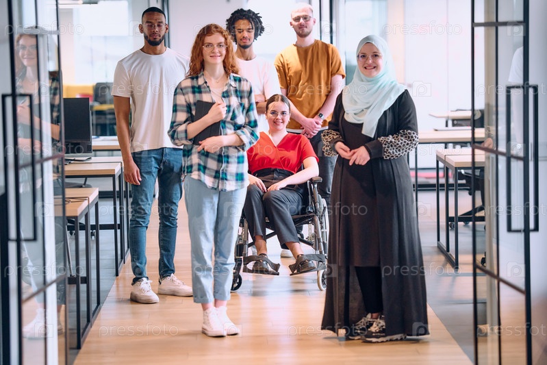Разнообразная группа молодых бизнесменов, идущих по коридору в застекленном офисе современного стартапа, включая человека в инвалидной коляске и женщину в хиджабе
