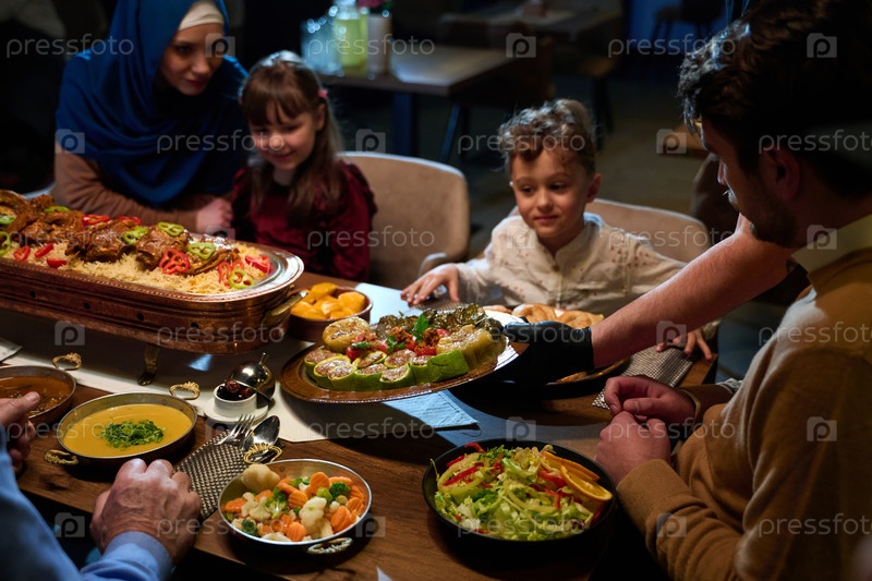 На этом захватывающем виде с воздуха вкусная еда, украшенная украшениями Рамадана, включая финики и мясо, ожидает прибытия европейской исламской семьи, обещая праздничное и ароматное празднование ифтара