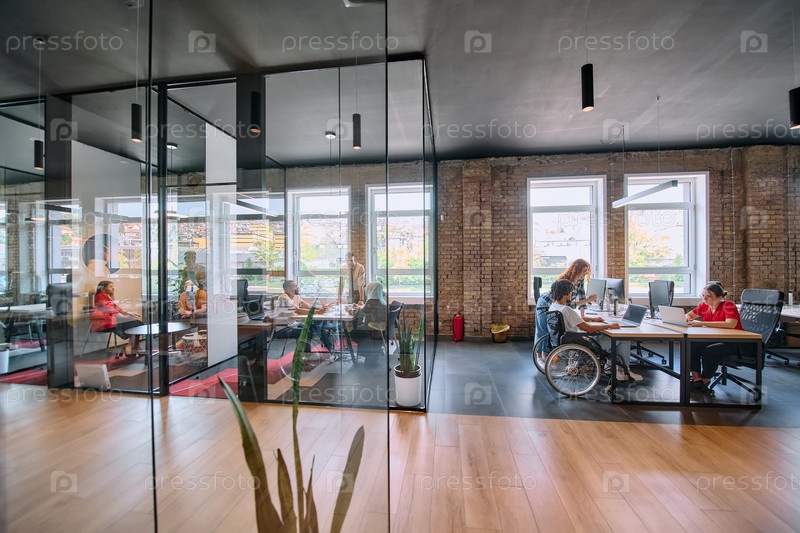 Разнообразная группа бизнес-профессионалов сотрудничает в современном коворкинг-центре для стартапов, используя сочетание бумажных и технологических инструментов, таких как мобильные телефоны и компьютеры