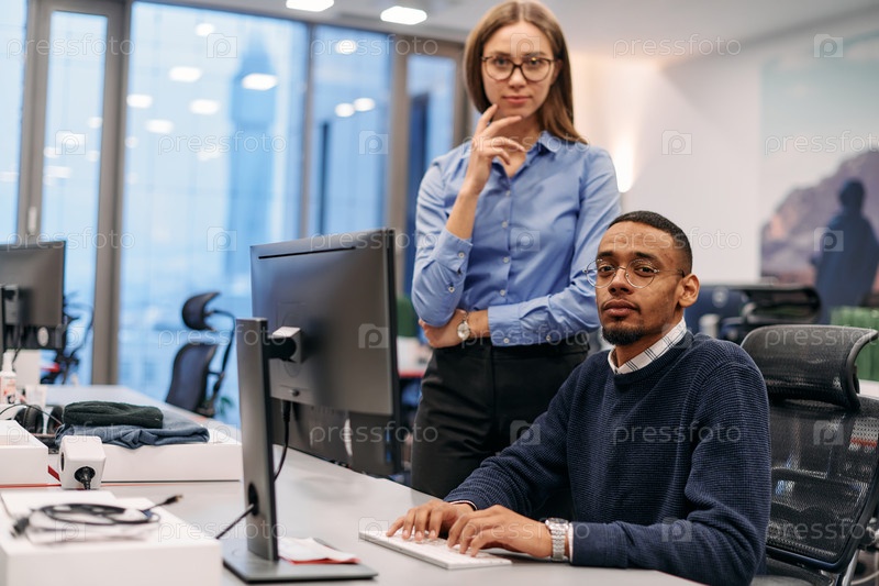 Цифровое сотрудничество: блондинка-бизнесмен и афроамериканский партнер просматривают документы в Интернете