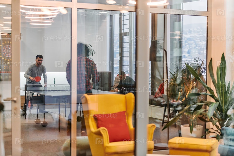 Коллеги по бизнесу отдыхают от работы, чтобы насладиться игрой в настольный теннис, способствуя командной работе и духу товарищества на рабочем месте