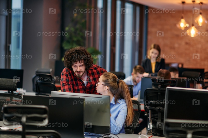 Коллеги по бизнесу, мужчина и женщина, обсуждают бизнес-стратегии, внимательно глядя на монитор компьютера, олицетворяя сотрудничество и инновации