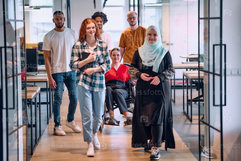 Разнообразная группа молодых бизнесменов, идущих по коридору в застекленном офисе современного стартапа, включая человека в инвалидной коляске и женщину в хиджабе