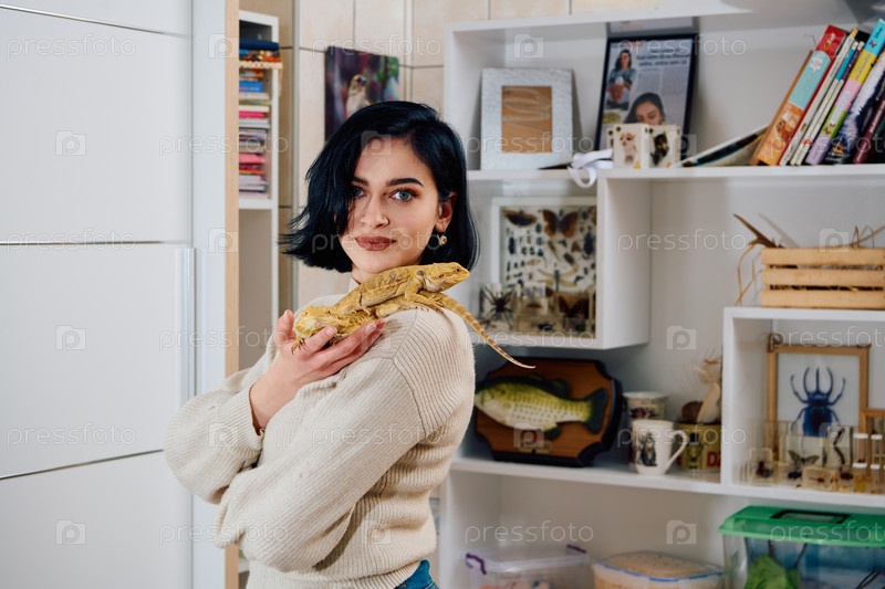 Красивая женщина позирует со своими двумя очаровательными бородатыми драконами