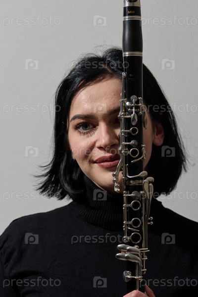 Изящная брюнетка-музыкант позирует с кларнетом на белом фоне