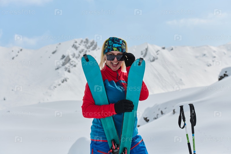 Профессиональная лыжница радуется успешному восхождению на заснеженные вершины Альп