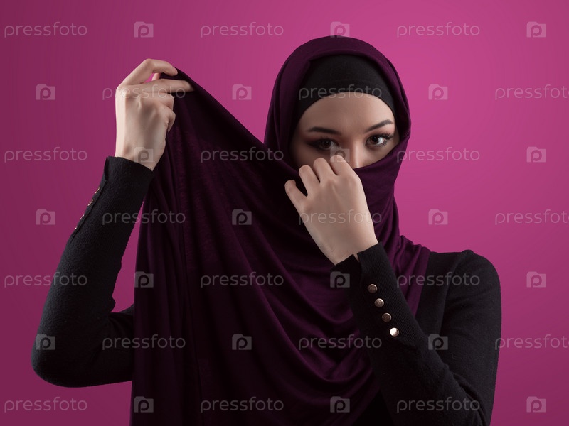 Современная мусульманка в стильной повседневной одежде в хиджабе изолирована на розовом фоне. Различные люди моделируют концепцию моды в хиджабе