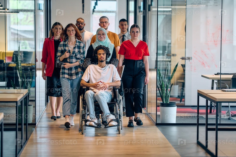 Разнообразная группа молодых бизнесменов собирается в застекленном офисе современного стартапа, в котором участвуют человек в инвалидной коляске, молодой афроамериканец и мусульманка в хиджабе