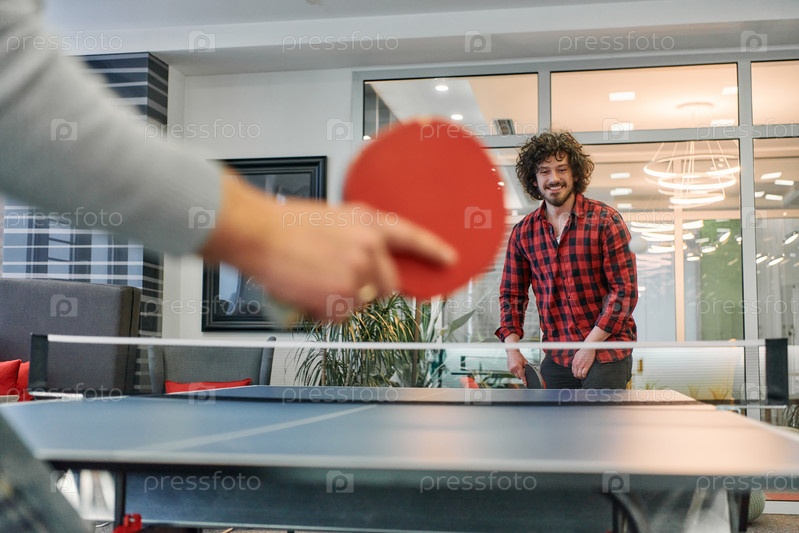 Коллеги по бизнесу отдыхают от работы, чтобы насладиться игрой в настольный теннис, способствуя командной работе и духу товарищества на рабочем месте