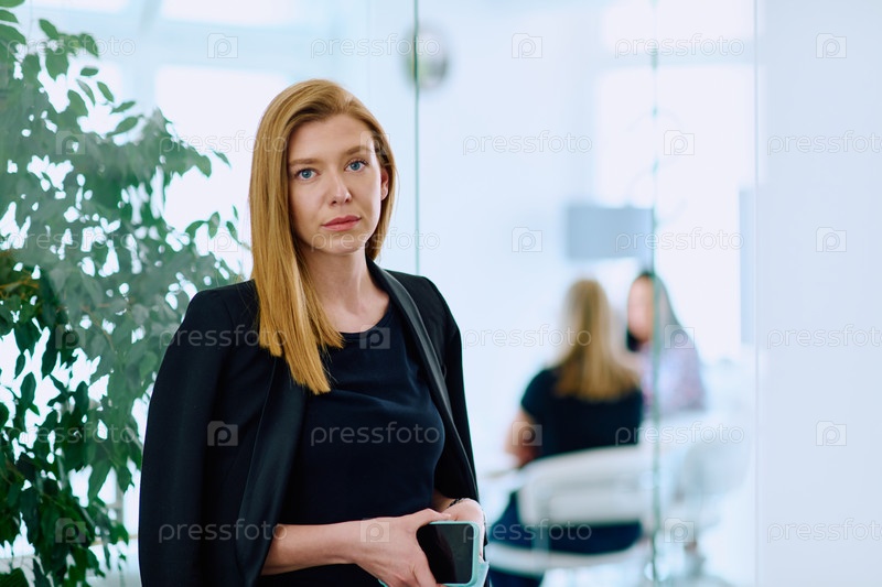 Портрет блондинки-предпринимательницы в современном офисе со своим рабочим пространством и коллегами на заднем плане