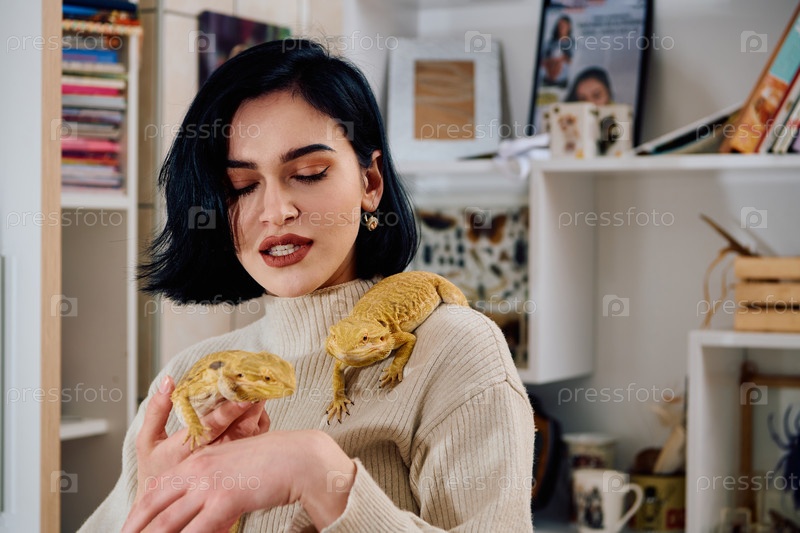 Красивая женщина позирует со своими двумя очаровательными бородатыми драконами