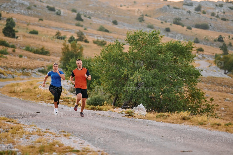 Пара, одетая в спортивную одежду, бежит по живописной дороге во время утренней тренировки, наслаждаясь свежим воздухом и поддерживая здоровый образ жизни