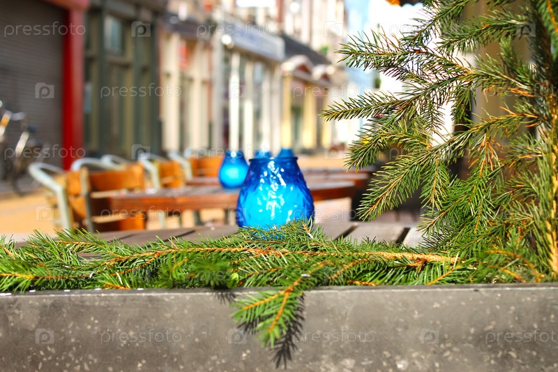 Зеленые сосновые ветви в уличном кафе в городе Горинхем. Нидерланды