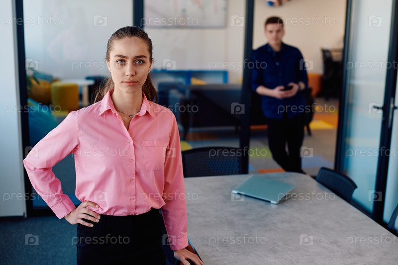Портрет молодой улыбающейся деловой женщины в креативном коворкинг-стартапе на открытом пространстве. Успешная деловая женщина, стоящая в офисе с копировальным пространством. Коллеги работают в фоновом режиме