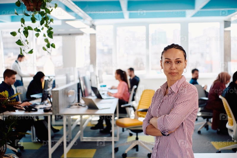 Портрет молодой улыбающейся деловой женщины в креативном коворкинг-стартапе на открытом пространстве. Успешная деловая женщина, стоящая в офисе с копировальным пространством. Коллеги работают в фоновом режиме