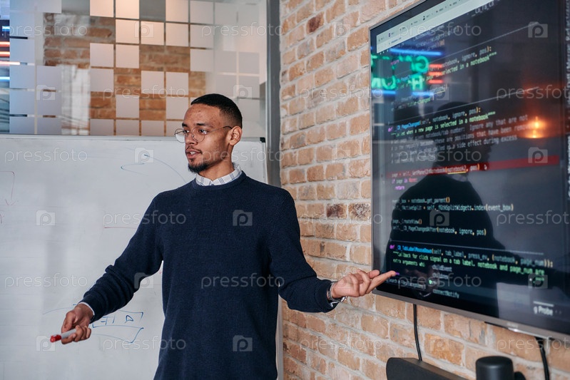 Афроамериканский бизнесмен убедительно презентует свою бизнес-стратегию своим коллегам, способствуя сотрудничеству и дальновидному мышлению