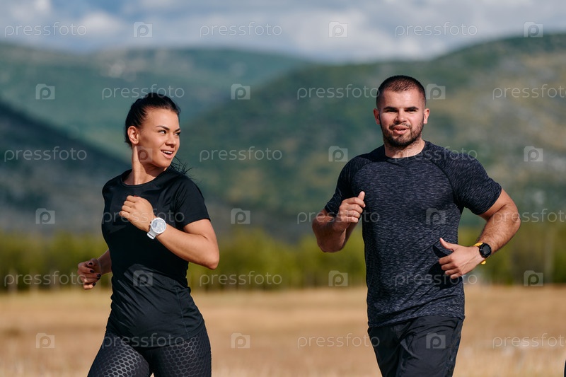 Пара, поддерживающая здоровый образ жизни, бегая в солнечный день