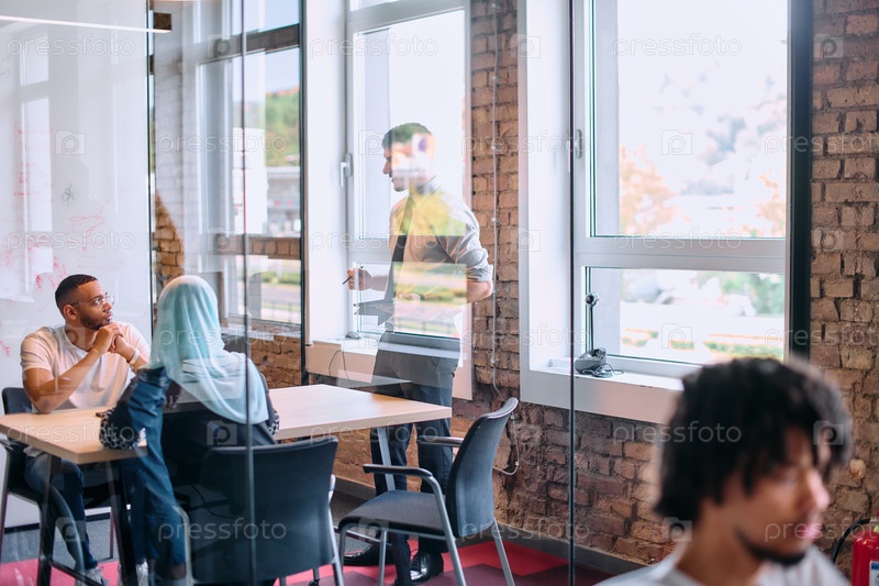 Разнообразная группа бизнес-профессионалов сотрудничает в современном коворкинг-центре для стартапов, используя сочетание бумажных и технологических инструментов, таких как мобильные телефоны и компьютеры