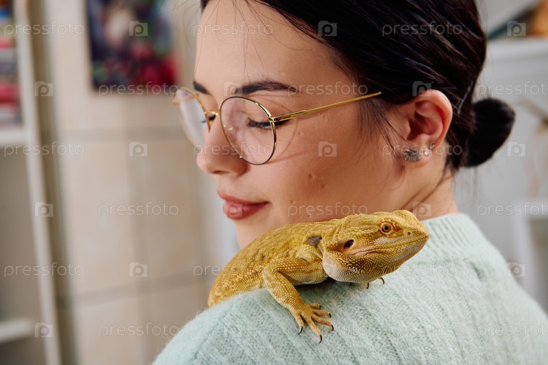 Красивая женщина позирует со своими очаровательными бородатыми драконами