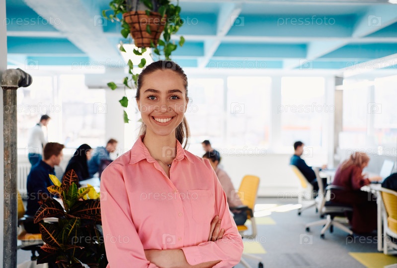 Портрет молодой улыбающейся деловой женщины в креативном коворкинг-стартапе на открытом пространстве. Успешная деловая женщина, стоящая в офисе с копировальным пространством. Коллеги работают в фоновом режиме