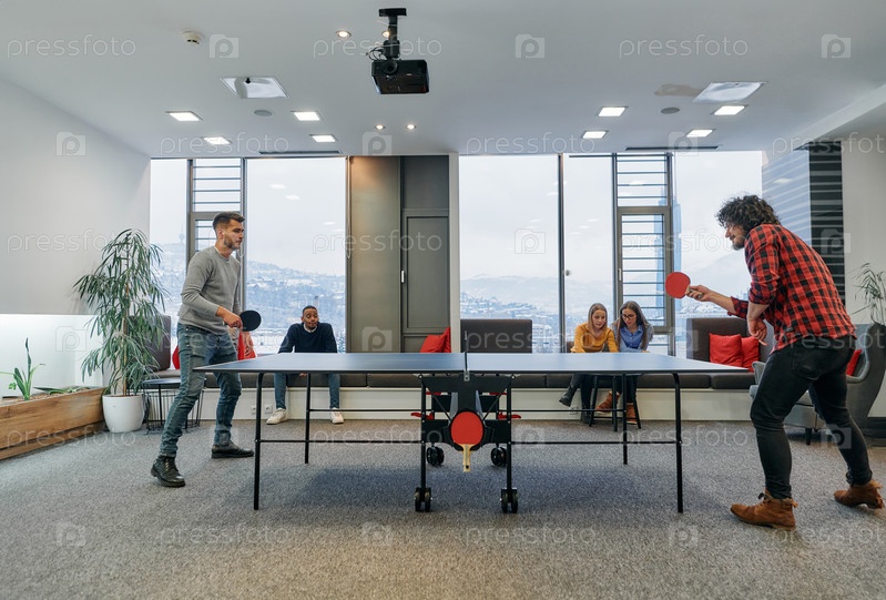 Коллеги по бизнесу отдыхают от работы, чтобы насладиться игрой в настольный теннис, способствуя командной работе и духу товарищества на рабочем месте