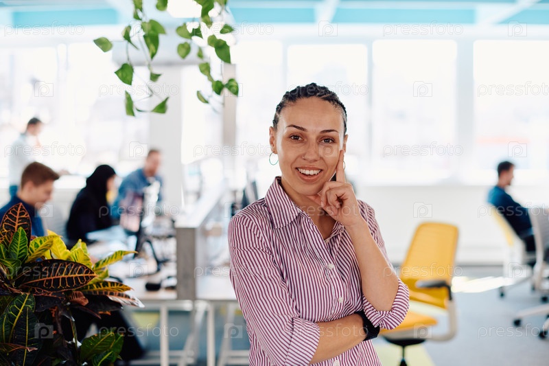 Портрет молодой улыбающейся деловой женщины в креативном коворкинг-стартапе на открытом пространстве. Успешная деловая женщина, стоящая в офисе с копировальным пространством. Коллеги работают в фоновом режиме