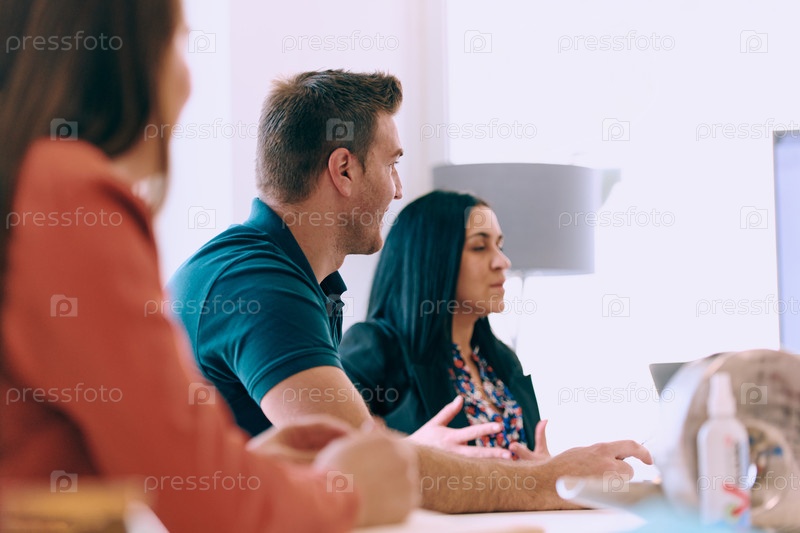Разнообразная бизнес-команда обсуждает проекты в современном стеклянном офисе