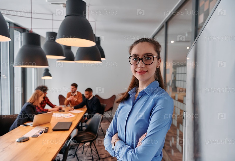 Бизнесвумен, ведущая встречу с коллегами в современном офисе