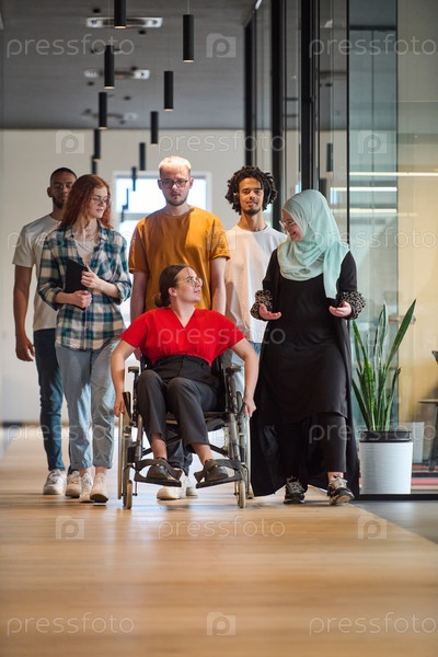 Разнообразная группа молодых бизнесменов, идущих по коридору в застекленном офисе современного стартапа, включая человека в инвалидной коляске и женщину в хиджабе