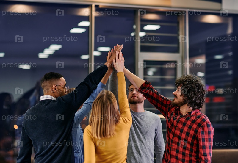 Обрадованные молодые многонациональные бизнесмены весело празднуют общий успех в бизнесе или победу на посту. Улыбающиеся сотрудники, принадлежащие к разным расам, чувствуют воодушевление, добиваются хороших результатов. Концепция совместной работы