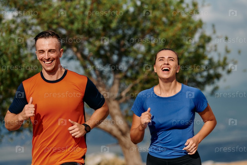 Пара, одетая в спортивную одежду, бежит по живописной дороге во время утренней тренировки, наслаждаясь свежим воздухом и поддерживая здоровый образ жизни