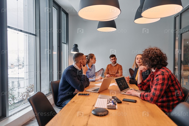 В оживленной атмосфере современного стартап-офиса разнообразная команда бизнес-профессионалов обсуждает различные проекты и разрабатывает новые бизнес-стратегии, олицетворяя креативность и инновации в предпринимательской сфере