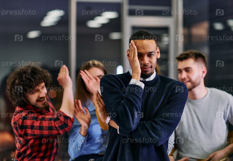 Группа молодых деловых людей весело играет в интересные игры, отдыхая от работы в современном офисе. Селективный фокус