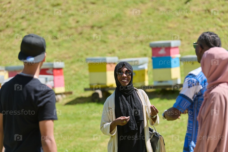 Разнообразная группа молодых друзей и предпринимателей изучает малые предприятия по производству меда в естественной сельской местности