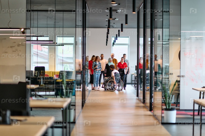 Разнообразная группа молодых бизнесменов, идущих по коридору в застекленном офисе современного стартапа, включая человека в инвалидной коляске и женщину в хиджабе