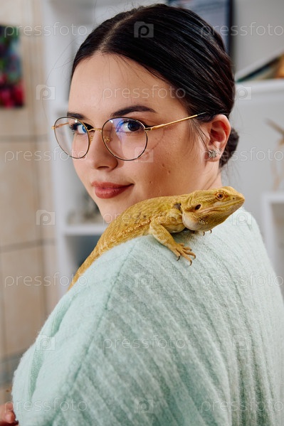 Красивая женщина позирует со своими очаровательными бородатыми драконами