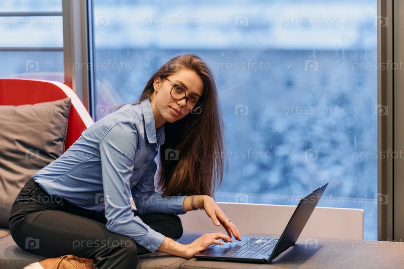 Деловая женщина использует свой ноутбук, сидя у окна большого корпоративного здания, на фоне которого открывается живописный вид на городской пейзаж