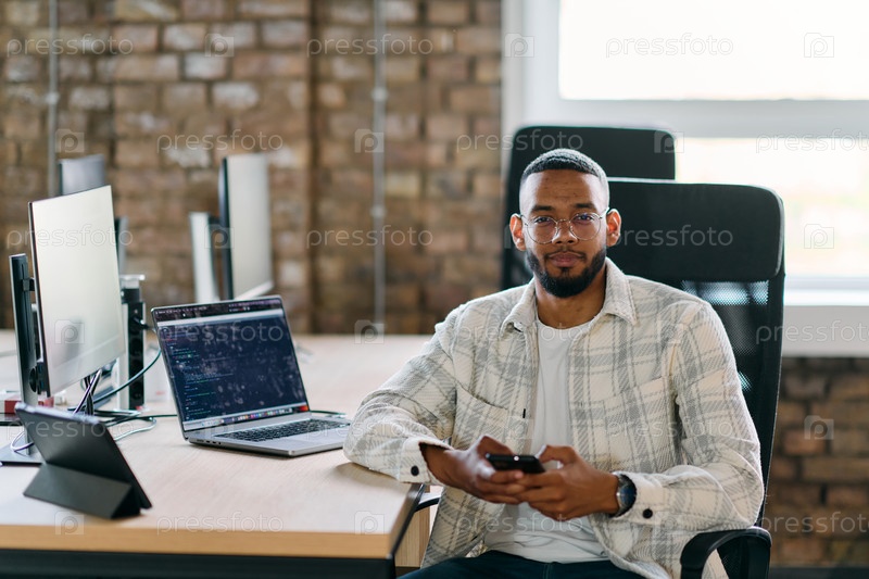 Афро-американский предприниматель отдыхает в современном офисе, используя смартфон для просмотра социальных сетей, ловя момент цифрового подключения и расслабления среди своих деловых усилий