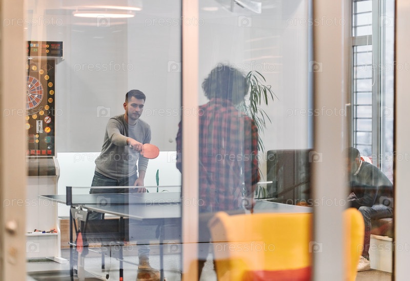 Коллеги по бизнесу отдыхают от работы, чтобы насладиться игрой в настольный теннис, способствуя командной работе и духу товарищества на рабочем месте