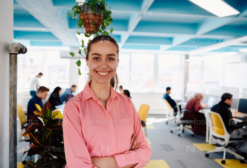 Портрет молодой улыбающейся деловой женщины в креативном коворкинг-стартапе на открытом пространстве. Успешная деловая женщина, стоящая в офисе с копировальным пространством. Коллеги работают в фоновом режиме