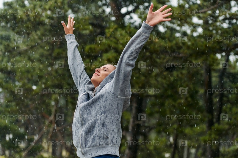 Красивая женщина наслаждается дождливым днем после интенсивной пробежки