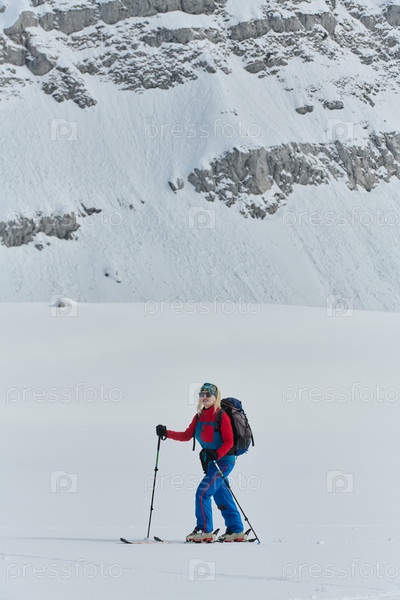 Профессиональная лыжница радуется успешному восхождению на заснеженные вершины Альп
