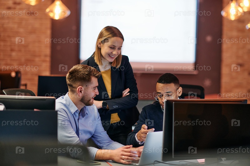 Стратегическая деловая встреча: группа профессионалов, сотрудничающих в офисе с помощью компьютеров
