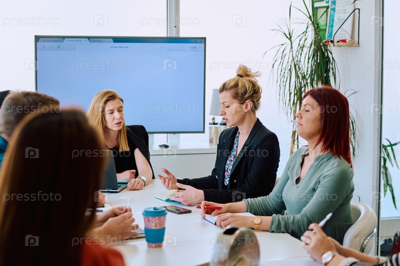 Разнообразная бизнес-команда обсуждает проекты в современном стеклянном офисе