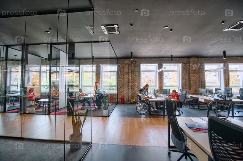 Разнообразная группа бизнес-профессионалов сотрудничает в современном коворкинг-центре для стартапов, используя сочетание бумажных и технологических инструментов, таких как мобильные телефоны и компьютеры