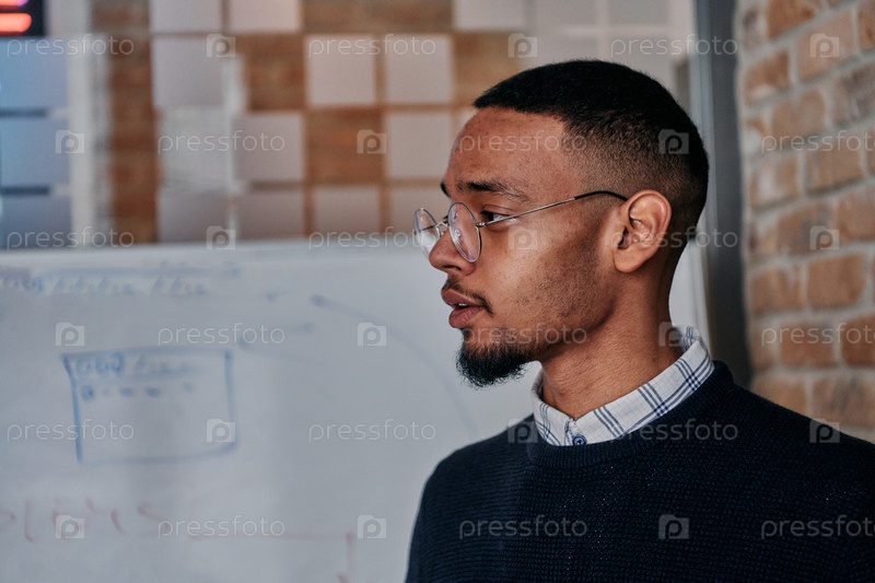 Афроамериканский бизнесмен убедительно презентует свою бизнес-стратегию своим коллегам, способствуя сотрудничеству и дальновидному мышлению