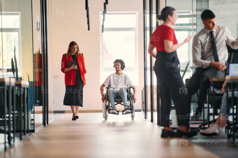 Бизнес-лидер со своим коллегой, афроамериканским бизнесменом-инвалидом, проходят мимо своих коллег, работающих в современных офисах