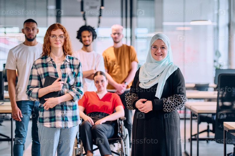 Разнообразная группа молодых бизнесменов, идущих по коридору в застекленном офисе современного стартапа, включая человека в инвалидной коляске и женщину в хиджабе