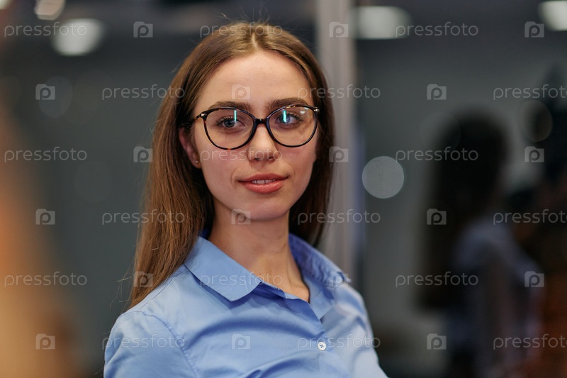 Уверенная деловая женщина в очках и синей рубашке участвует в обсуждении в офисе