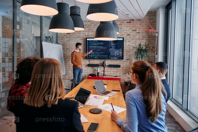 В корпоративной обстановке бизнесмен проводит встречу, страстно представляя бизнес-план своей внимательной команде, способствуя сотрудничеству и стратегическому мышлению